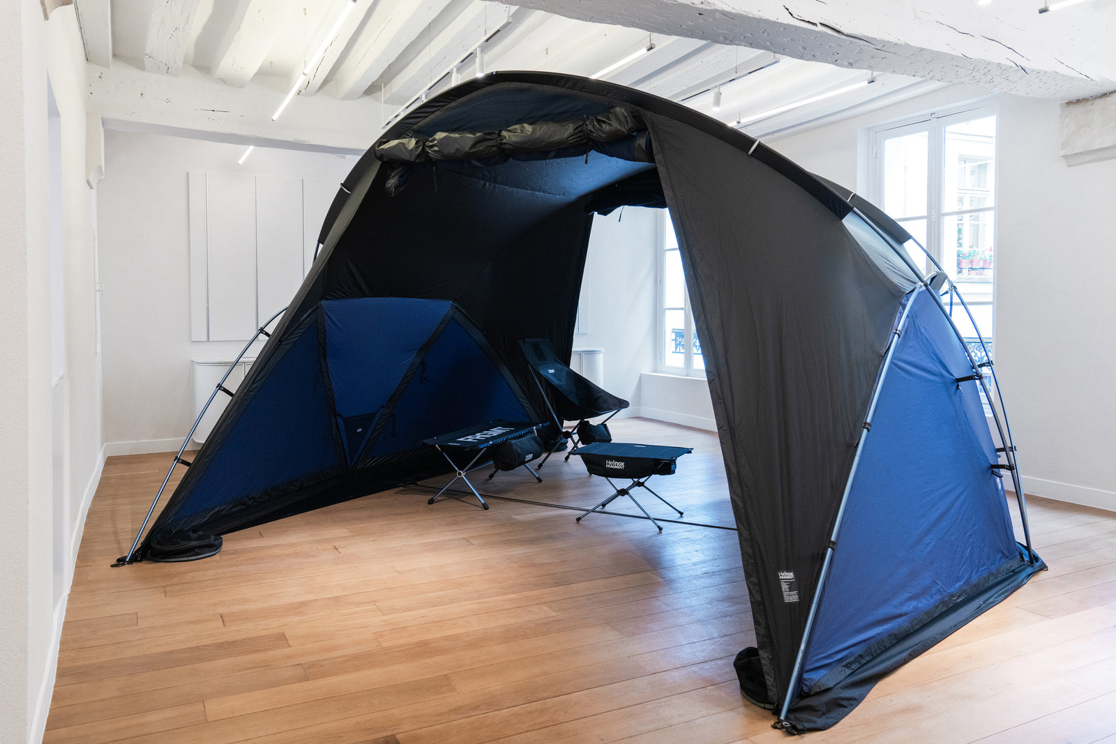 Upstairs, the open space is intended to be warm like a Parisian apartment, presenting Helinox furniture in an elegant universe.